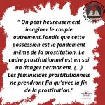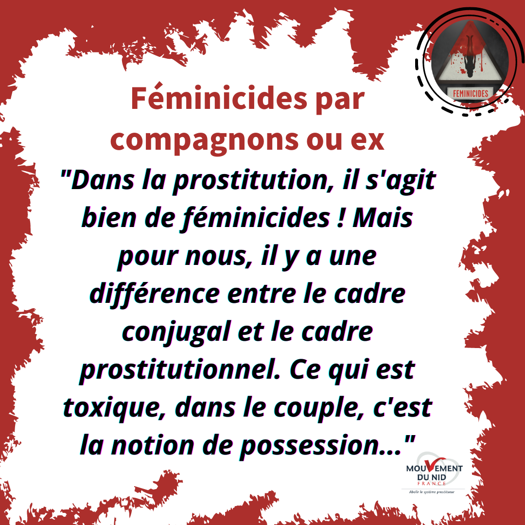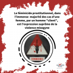 Si la loi de 2016 a représenté un progrès en faisant juridiquement des violences contre des personnes prostituées un facteur aggravant, il faut désormais faire reconnaître ces meurtres comme des féminicides à part entière. Et dire stop à toute forme de violence prostitutionnelle, du harcèlement à la violence conjugale (conjoint proxénète), en passant par les insultes, coups, et viols imposés par l’argent. Les prostitueurs ne peuvent plus être considérés comme de simples « clients ». Mais au regard de la violence qu’ils infligent par la contrainte de l’argent, comme des agresseurs qui ne doivent plus rester impunis. La loi  du 13 avril 2016 doit donc être appliquée pleinement tout comme les dispositions de la loi d’avril 2021 qui renforcent la pénalisation des prostitueurs de mineur·es (obtenir un acte sexuel en échange d’argent est désormais passible du crime de viol).