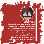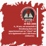 Mais certains restent oubliés : les féminicides commis dans le milieu prostitutionnel, le plus souvent par des « clients » et des proxénètes, contre des femmes et des personnes transgenre.