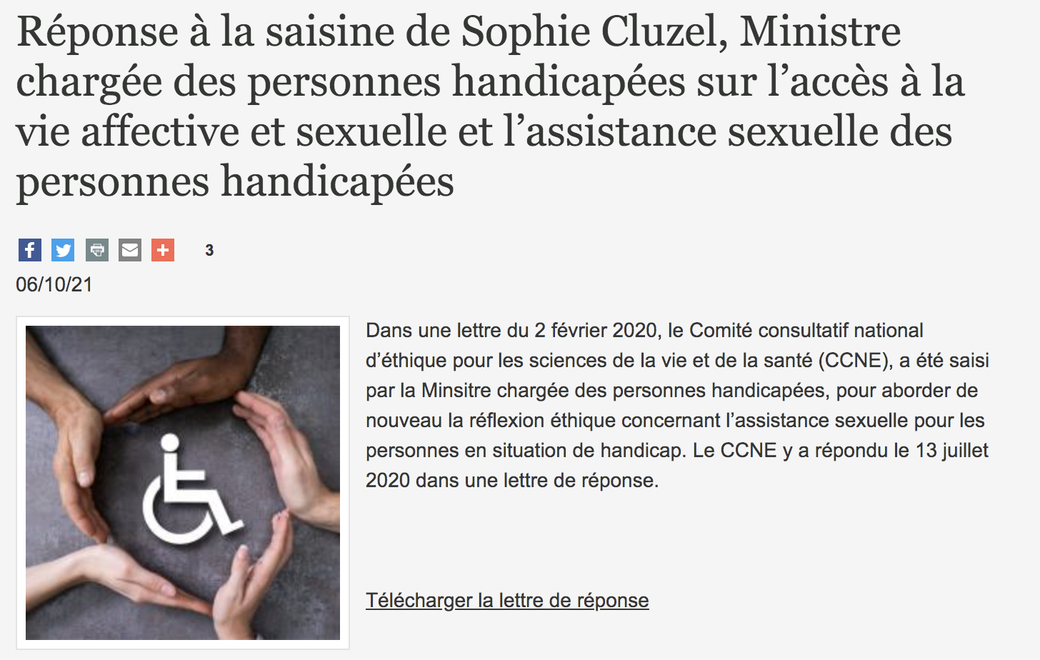 Le Comité consultatif national d’éthique pour les sciences de la vie et de la santé (CCNE) a donné réponse en juillet 2021 à Sophie Cluzel. La secrétaire d’Etat chargée des personnes handicapées avait relancé la demande de création de services « d’assistance sexuelle » pour les personnes en situation de handicap. Sans s’y opposer frontalement, le CCNE rappelle la nécessité qui s’ensuivrait « de modifier le cadre légal relatif à la prostitution et donc de s’affranchir des principes éthiques qui s’y réfèrent », auxquels il déclare être « particulièrement attaché ». Il renvoie donc la décision à la sphère politique et législative.