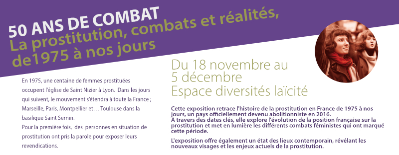 La délégation de Haute-Garonne du Mouvement du Nid propose, du 18 novembre au 5 décembre, une exposition « 50 ans de combat, la prostitution, combats et réalités, de 1975 à nos jours, à l’Espace diversités laïcité.
